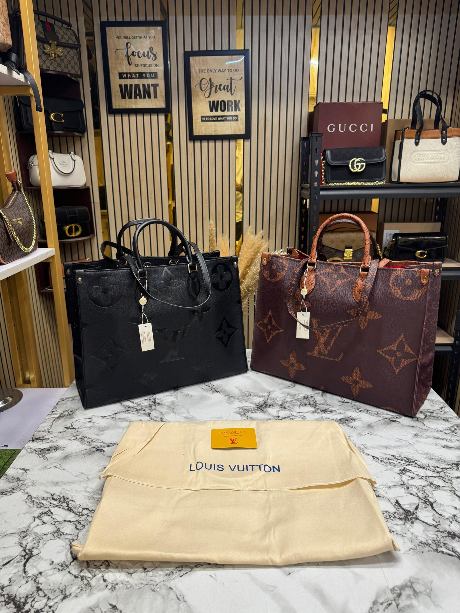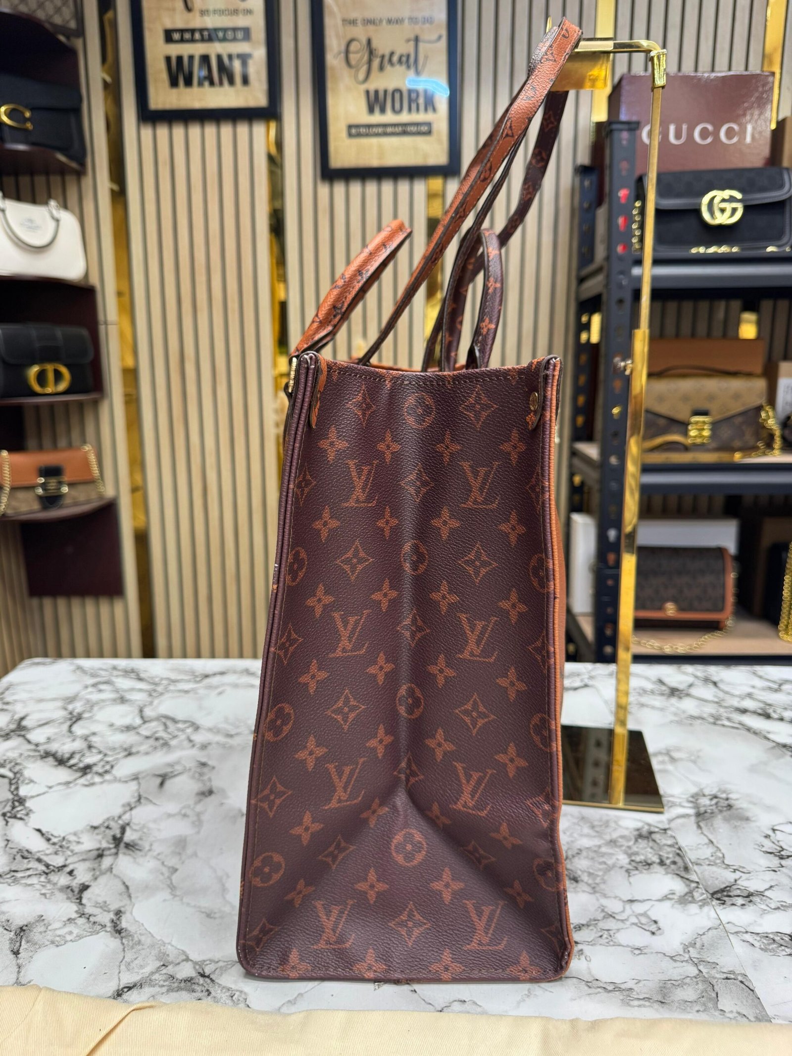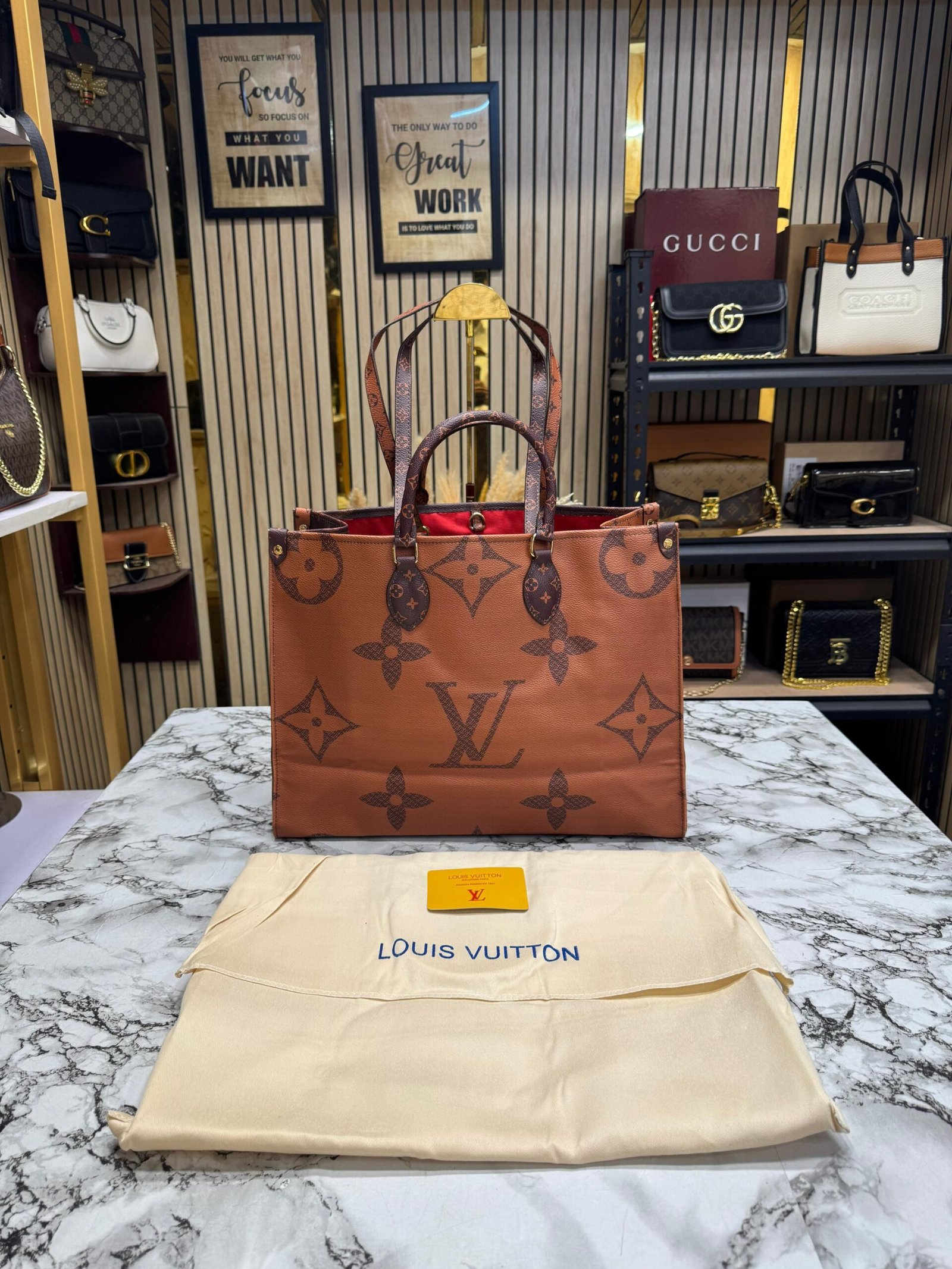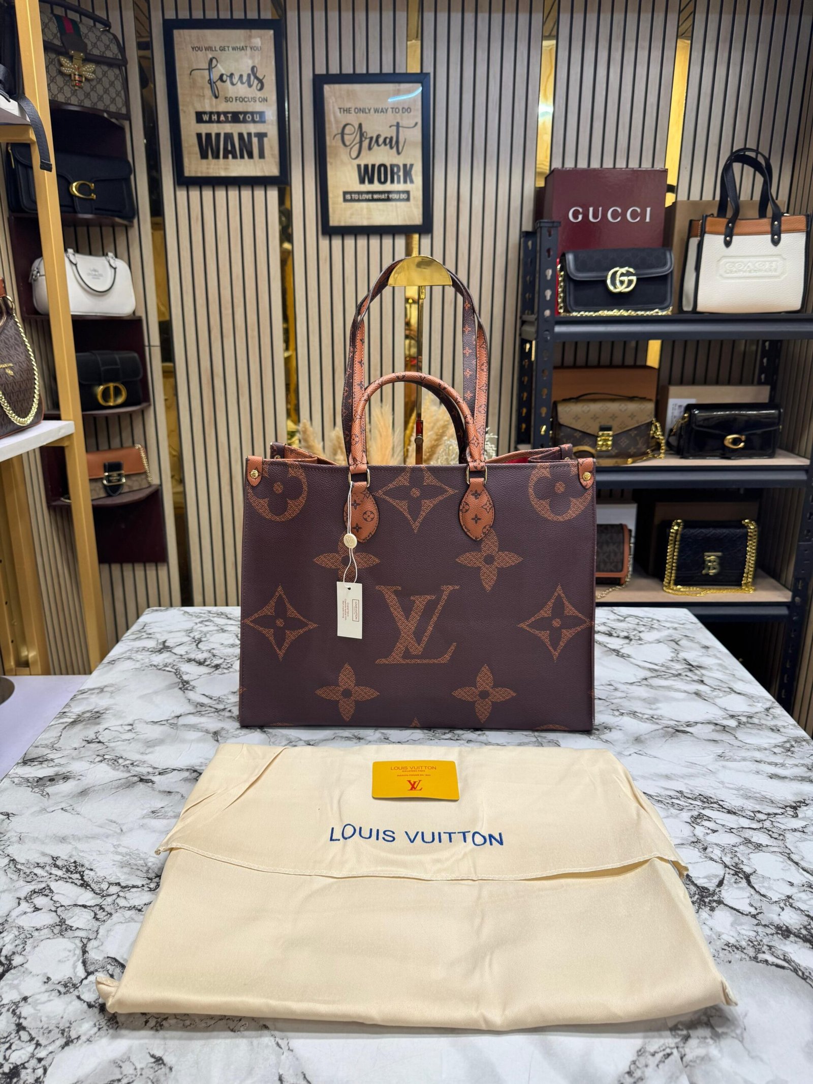 LOUIS VUITTON ON THE GO WITH ORIGNAL DUST BAG AND CARRY BAG PREMIUM QUALITY ( BROWN MONO )